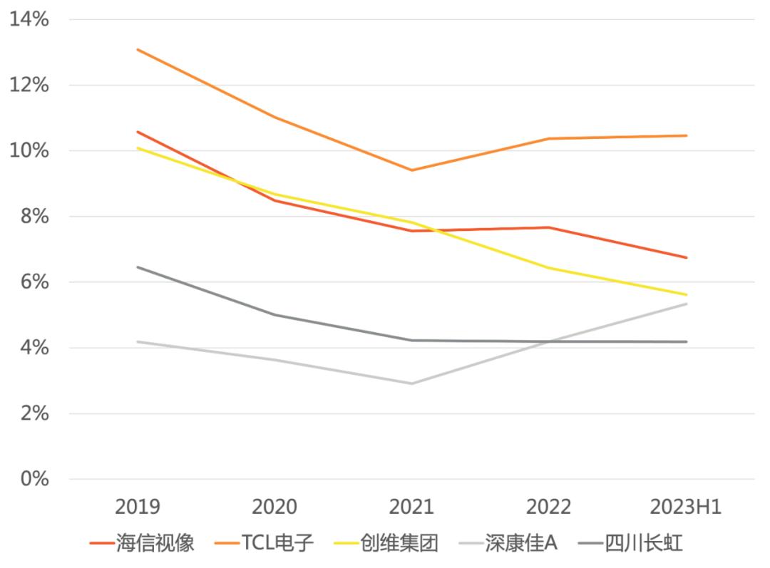 2019-2023H1主要电视厂商上市公司的销售费用率,连线Insight根据公司财报制图