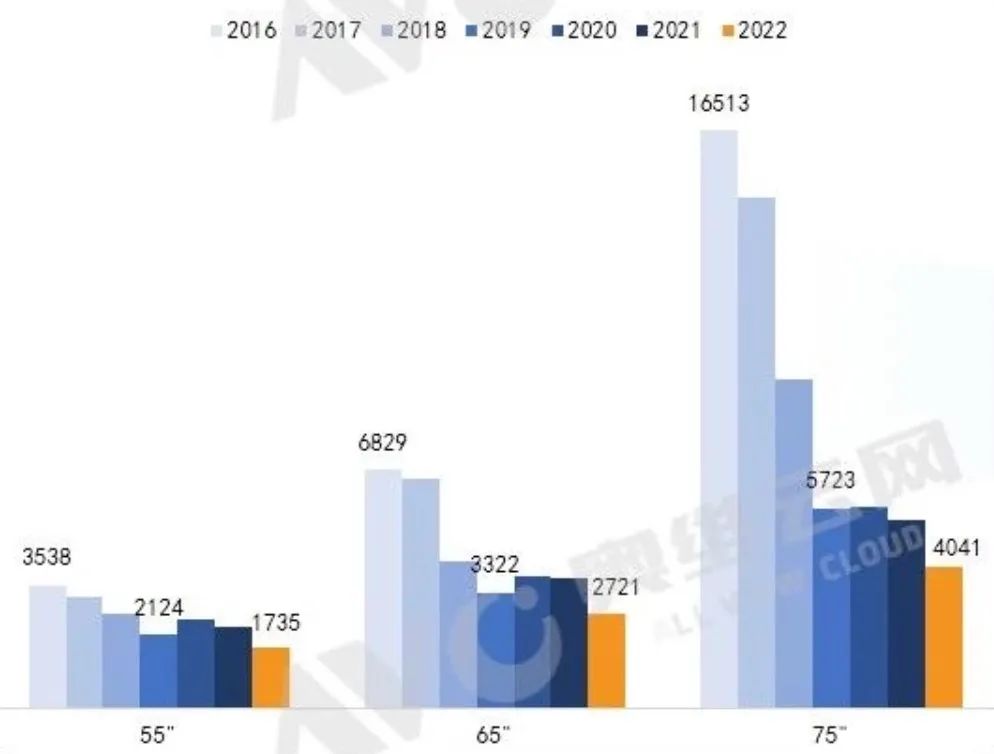 电视行业素以价格战频繁著称,每年线上大促、线下大卖都是重头戏。若以双11大促为观察节点来看,根据奥维云网数据,55吋、65吋、75吋彩电的线上价格逐年下滑。而且屏幕尺寸越大,推出早期享受的技术溢价越高,下滑速度就越快。2016-2019年双11,55吋、65吋、75吋彩电的线上价格分别下滑40%、51%、65%,2019-2022年则分别下滑18%、18%、29%。