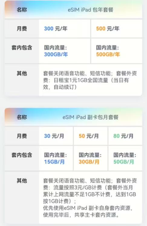 iPad eSIM包年套餐共两个档位,300元、500元,分别提供300G和500G流量,套餐外流量则是1元1GB。该套餐关闭了语音通话和短信功能,只能作上网使用。