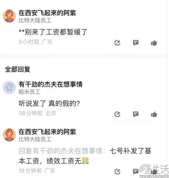 据多名比特大陆内部员工透露,该公司9月经营现金流仍未转正,因此将暂缓发放9月份全体员工的部分工资,10月7日假期后再视情况发放。目前在职场社交平台脉脉社区中,就有认证信息为比特大陆员工的用户透露,工资暂缓一事属实,目前补发了基本工资,绩效工资尚未补发。