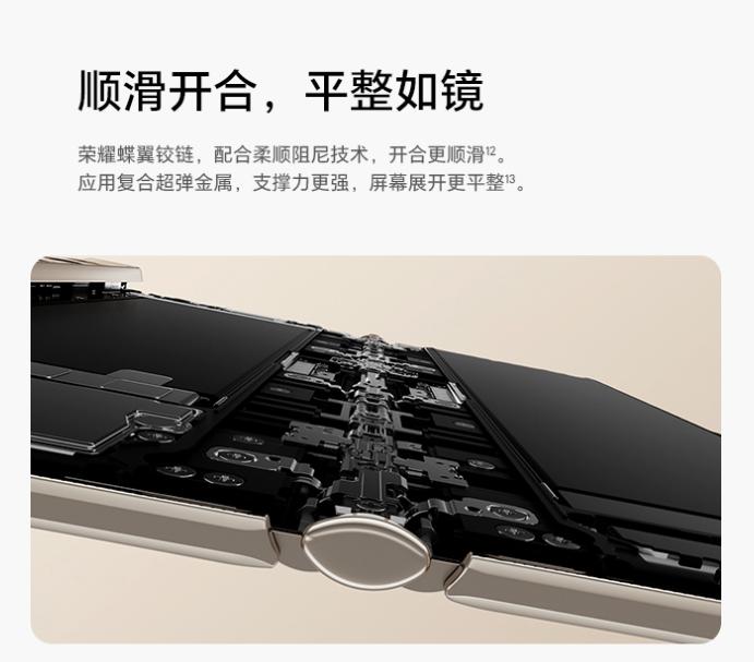 同时荣耀V Purse为了避免过于轻薄而导致机身强度不够,它采用了蝶翼铰链,配合柔顺阻尼技术,让开合间更为顺滑,提高了用户的使用体验。配合符合超弹金属,支撑力更强,让荣耀V Purse兼具轻薄和强度。