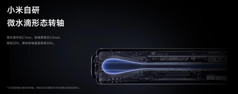 小米为了打造MIX Fold 2纤薄的设计,加强折叠屏的实用性。自研了微水滴形态转轴,使得转轴厚度仅3.0mm,整体转轴重量下降35%。不仅如此,小米通过使用碳钎维双翼浮板、减少零件、空间化立体折叠等方式,都能让机身厚度和重量有一定程度的下降。