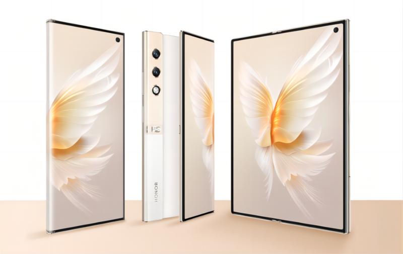 荣耀在研究折叠屏轻薄化的方面也是一位好手。其在2023年7月推出的荣耀Magic V2,凭借其仅9.9mm的折叠厚度和231g的重量,引领着折叠屏进入“毫米”时代。作为对比,同期的iPhone 14 Pro max的重量为240g,荣耀Magic V2的重量已经能够意见直板旗舰了。