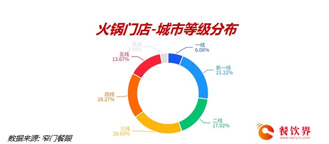 门店数量方面,截至2023年4月7日,我国火锅门店总数达到482593家,近一年新开店124144。按照城市等级分布来看,新一线城市门店占比最高,达到21.22%,其次为三线、四线、二线城市,分别占比20.65%、18.27%、17.02%。