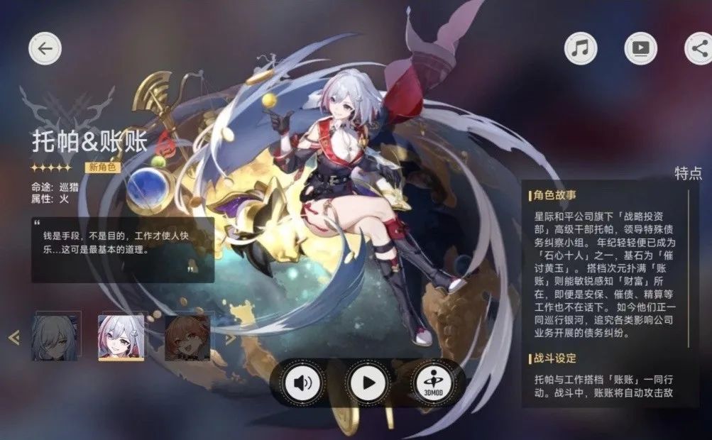 和职场不得意的「青雀」形成鲜明对比的,是最新1.4版本更新的新角色「托帕」。以下是官方介绍: