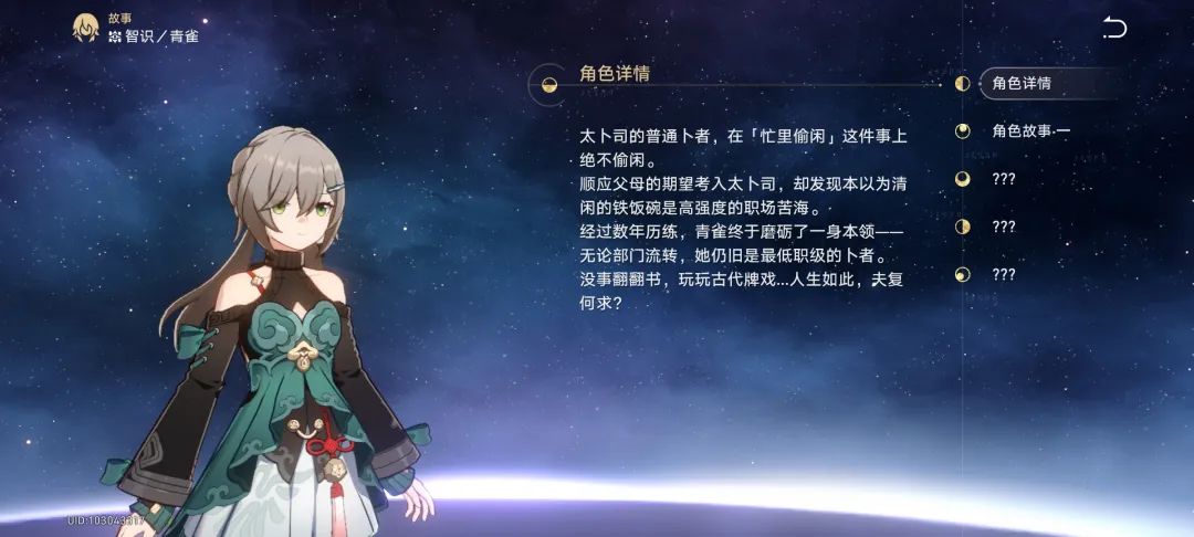 是不是对于一些中低线城市青年,很有代入感?此处的代入感,不仅仅是带入《崩铁》这一游戏、「青雀」这一角色,更是带入一些玩家自身的身份、处境、遭遇——从角色身上,看到自己。