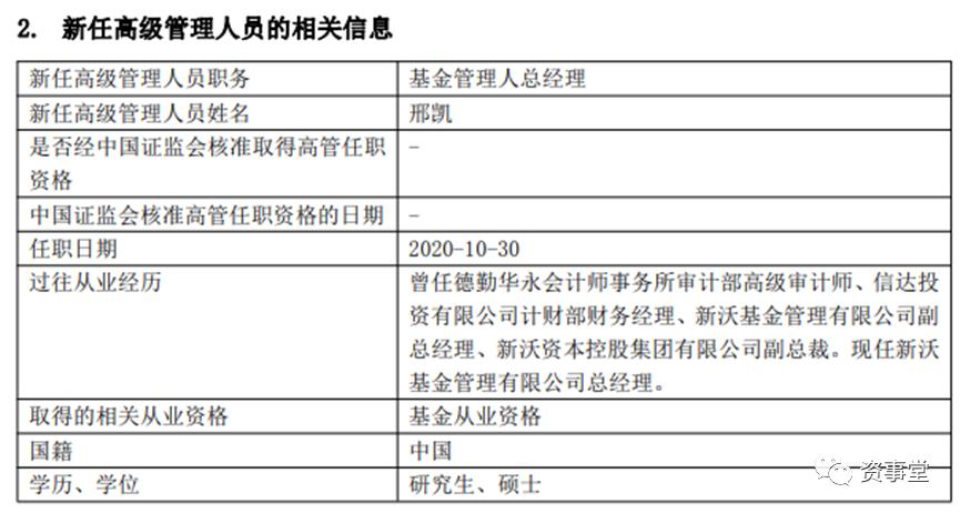 邢凯同时辞任了新沃财务负责人的职务,并告别新沃基金。他的职务由公司现任董事长代为履职。