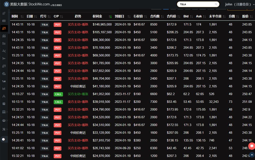 在美股大数据StockWe 期权异动大单界面,我们可以看到,今天机构买入了海量的看跌期权,排在第一第二位的权利金都达到了上亿美元,后几位权利金也达到了几千万。