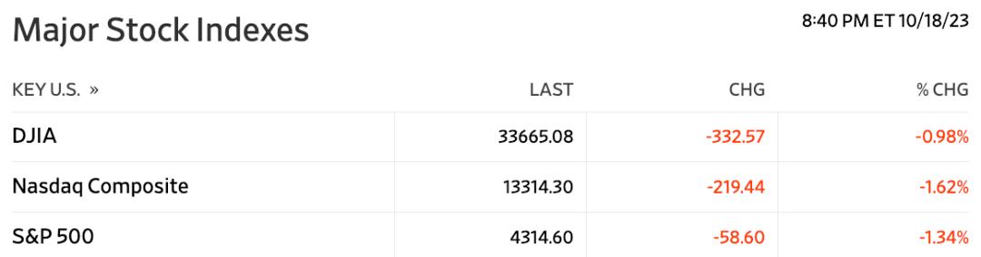 截至收盘,道指跌幅0.98%;纳指跌1.62%;标普500指数跌1.34%。