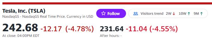 特斯拉盘后股价大跌4.55%