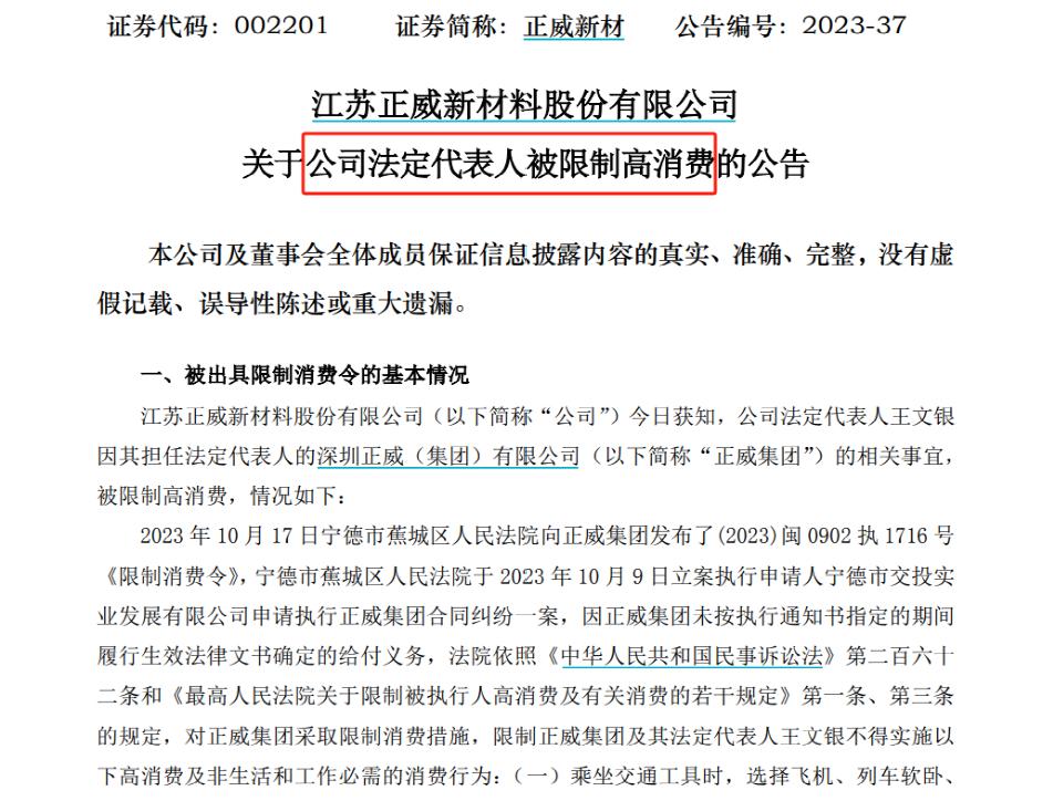正威新材表示,该限制消费令属于对正威集团及其法定代表人(王文银)发出的限制消费令,对本公司经营并无较大影响。