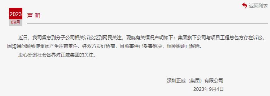 9月4日, 正威集团于官网发布了声明称,集团旗下公司与项目工程总包方存在诉讼,因沟通问题致使集团产生连带责任。经双方友好协商,目前事件已妥善解决,相关影响已解除。