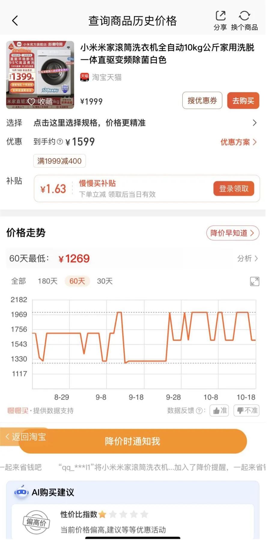 以小米天猫官方旗舰店为例,小米滚筒洗衣机全自动10KG这款产品,30天内的最低价是9月24日的1299元,10月12日上涨至1599元,10月13日进一步上涨至1999元,而到10月17日则下降至1599元。