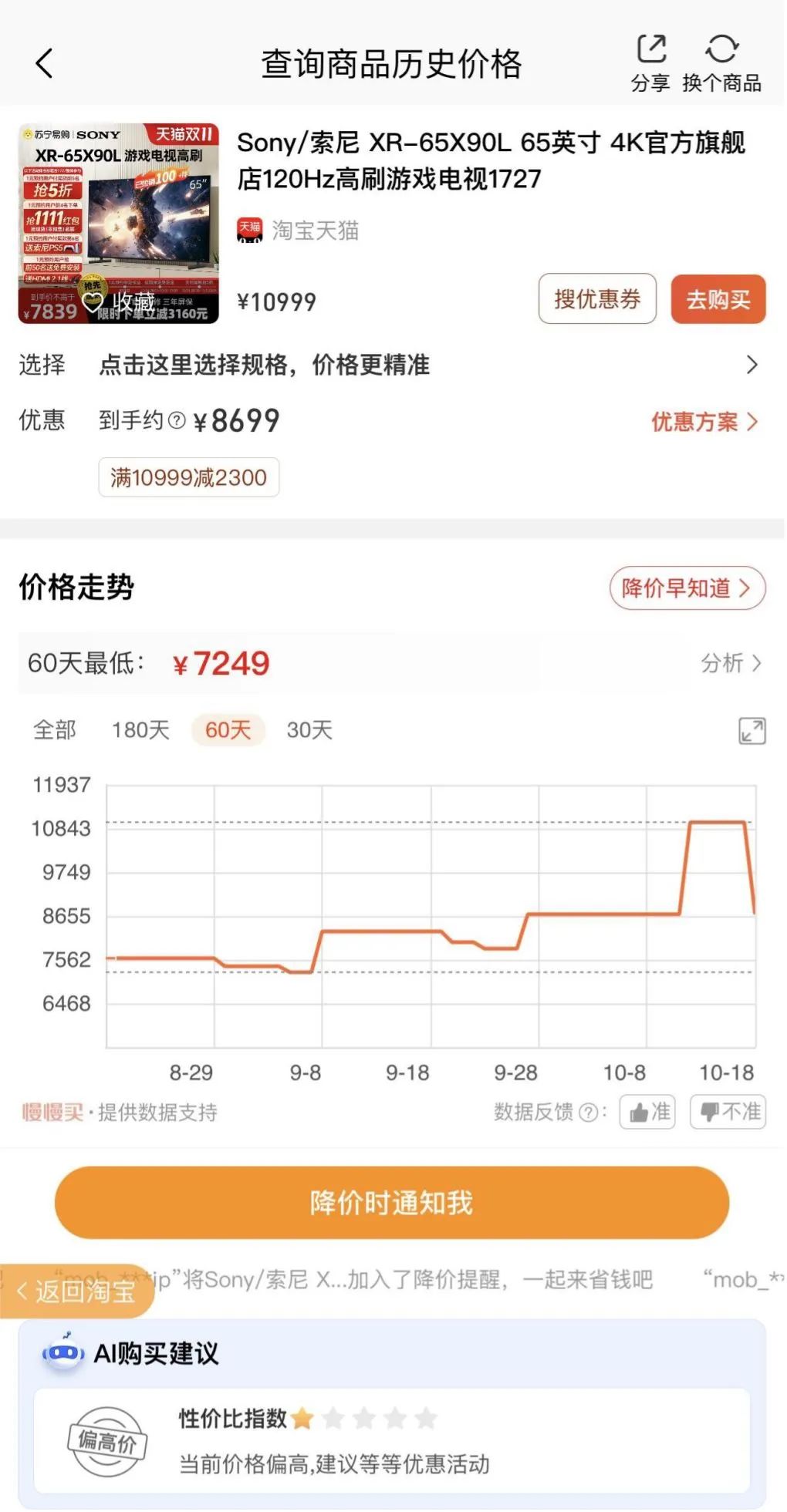 再以苏宁易购天猫官方旗舰店为例。Sony/索尼 XR-65X90L 65英寸 4K官方旗舰店120Hz高刷游戏电视1727这款产品,60天内最低价为9月5—7日的7249元,30天内最低价则为9月23—26日的7839元。