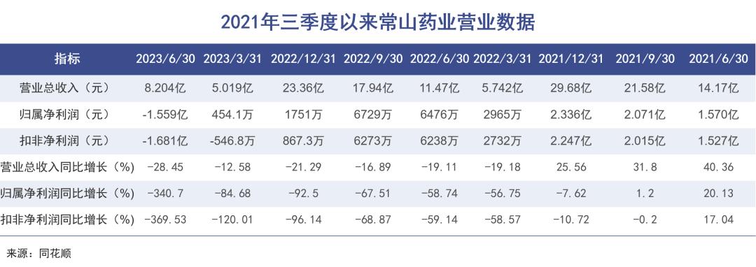从2021年三季度以来,常山药业已经连续6个报告期营收负增长,连续7个报告期净利润负增长,连续8个报告期扣非净利润负增长。