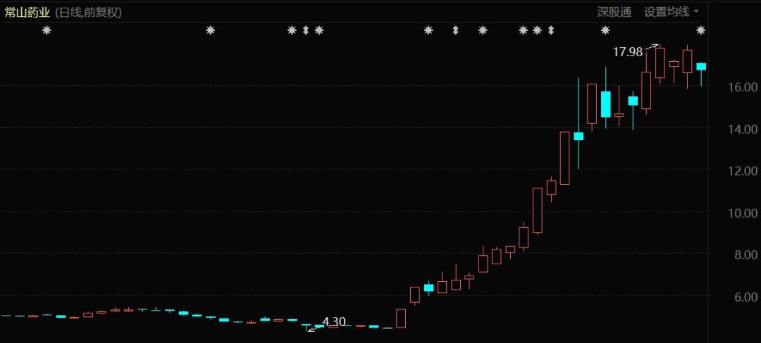 9月8日,常山药业收盘价为4.44元,处于历史低点区间。但是,在接下来的22个交易日中,常山药业收获了18个交易日的上涨,其中包括5个20%的涨停,和3个10%以上的大涨,股价妖孽般增长至17.69元,涨幅高达298.42%。