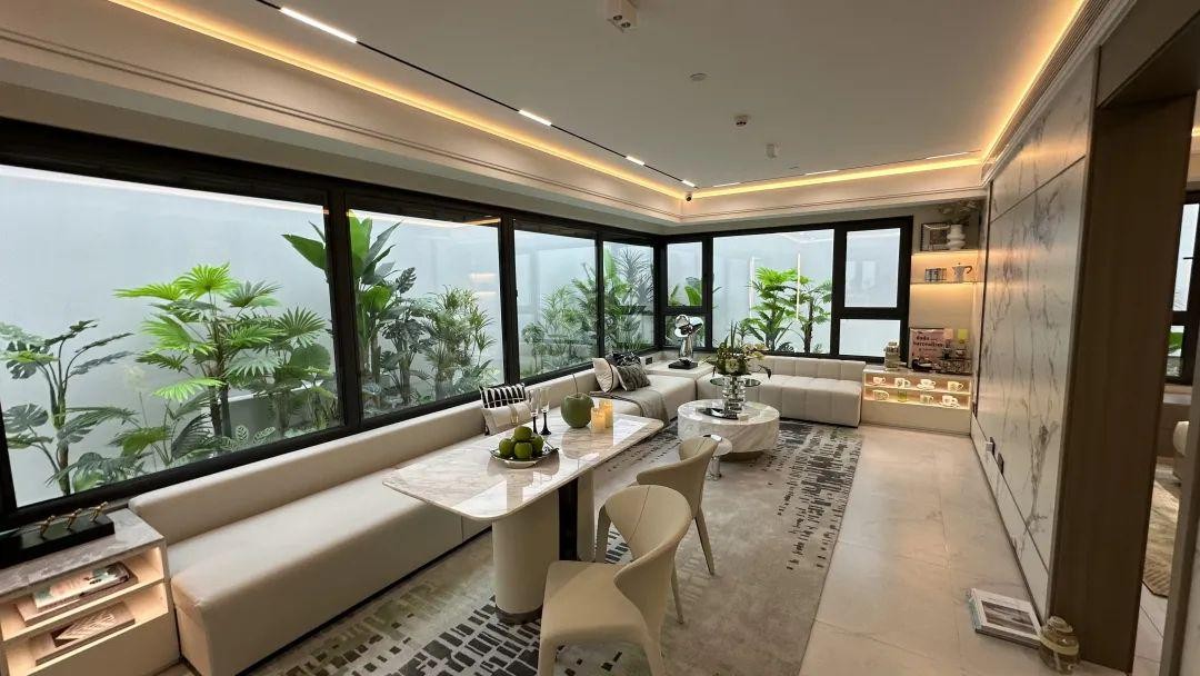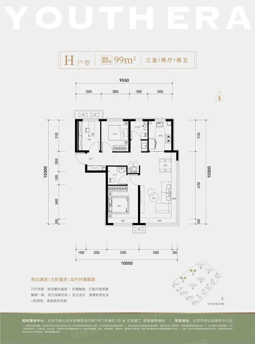 现场设有74平米两居、99平米三居、104平三居的样板间,其中99平三居室的现场到访参观量最多,设计亮点是270度的客厅飘窗。所有楼栋、户型都采取同层排水及精装修交付。