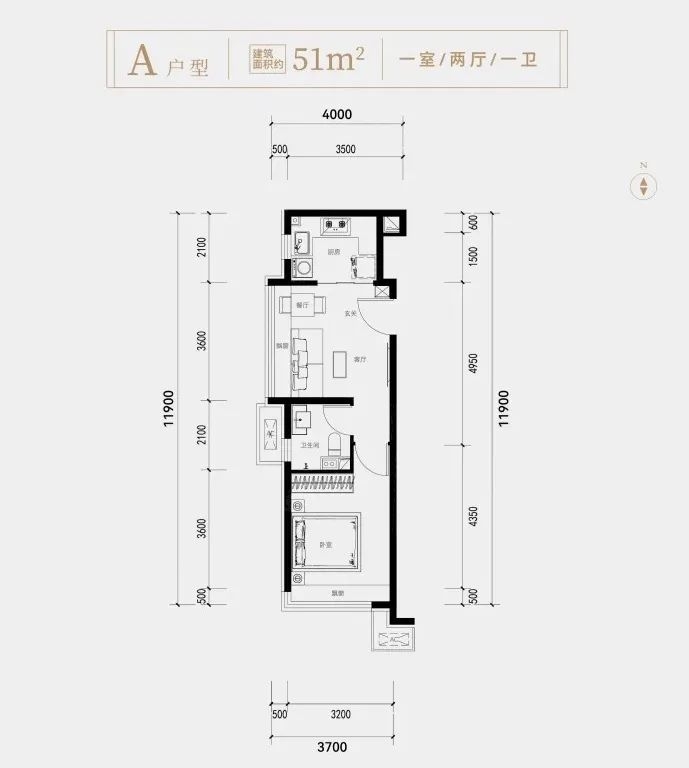 一居室没有样板间,从户型图看南面宽约3.2米,进深约12米,由南向北依次为卧室、卫生间、客厅及厨房,每个空间都有窗。