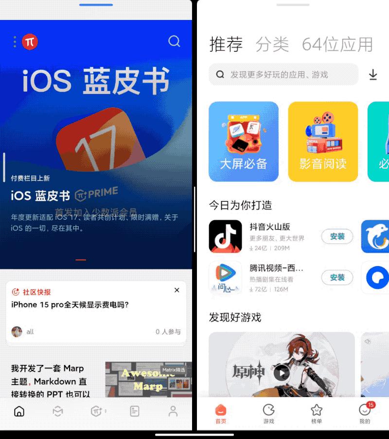 关于分屏当然不止这点可吐槽——我甚至都没提那个除了「关闭一侧 app」之外毫无作用的分屏比例调节杆。但,包括折叠屏在内,不熟悉 Android 大屏设备的朋友可能会觉得奇怪:你为什么对一个分屏功能这么在意?