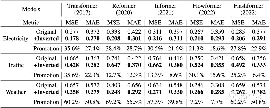 在取得最佳效果的同时,作者在Reformer、Informer、Flowformer、Flashformer等Transformer变体模型上进行了倒置前后的对比实验,证明了倒置是更加符合时序数据特点的结构框架。