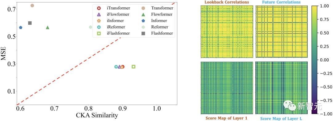 作者对倒置前后的模型分别计算底层-顶层CKA,得到了如下的结果,印证了iTransformer学习到了更好的序列特征,从而达到了更好的预测效果。