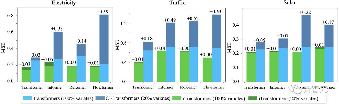 通过倒置,模型在推理时可以输入不同于训练时的变量数,文中将其与一种泛化策略——通道独立(Channel Independence)进行了对比,结果表明该框架在仅使用20%的变量时依然能够尽可能减少泛化误差。