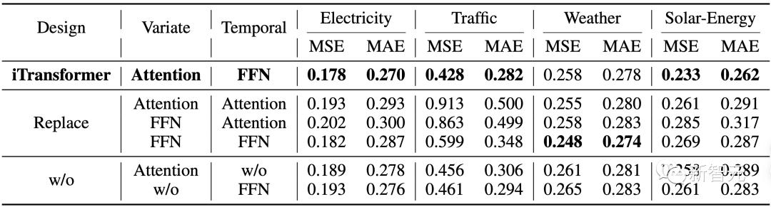 结果表明在变量维使用自注意力,在时间维上使用线性层的建模方式在绝大部分数据集上都取得了最优效果。