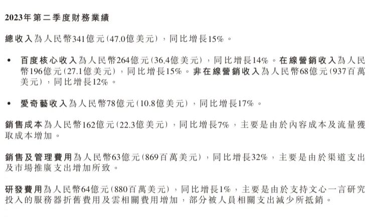 百度2023年第二季度财务业绩部分截图
