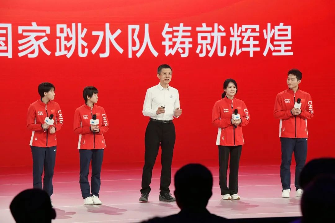 王海峰拉来了中国跳水队现身说法,国家跳水队教练、奥运五金王陈若琳和奥运冠军全红婵、陈芋汐、王宗源现场讲述基于文心一言等百度大模型技术形成的国家跳水队AI辅助训练系统对运动员日常训练的助力。