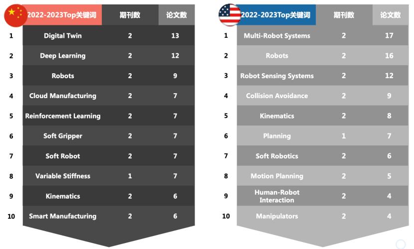 此外,2022 年到 2023 年上半年中国关键词集中在深度学习、强化学习、数字孪生、云制造、软抓手和可变刚度等领域。与此不同,美国的研究重点放在了安全碰撞避免、机器人感知系统、多机器人系统和路径规划上。这突显出中美两国在机器人学科的关注领域存在一定差异。
