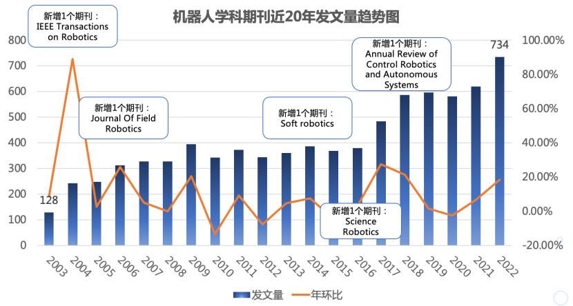 整体来看,近 20 年来,机器人学科的研究发展迅猛,所受关注度持续暴增。在过去的 20 年里,SCIE 的 Robotics 学科一区收录期刊从 2 个上涨到 7 个,所刊登的论文数量增加了近 6 倍。回顾 2003 年,两个期刊共计有 128 篇机器人学科论文发表,仅一年后,随着《IEEE Transactions on Robotics》的创刊,论文数量急剧增加了 89.1%,标志着机器人学科领域逐渐壮大的开端。在此后的近 20 年中,机器人相关期刊从 3 个期刊逐步增加至 7 个期刊,刊登论文数量整体呈上涨趋势,2022 年刊登的论文数量达到了 2003 年的将近 6 倍,代表着该学科领域的研究持续蓬勃发展;与此同时,近年来新创刊的期刊也为该学科的研究者提供了更多专业化、多样化的机会,如 《Annual Review of Control Robotics and Autonomous Systems》主攻机器人自动控制相关研究。