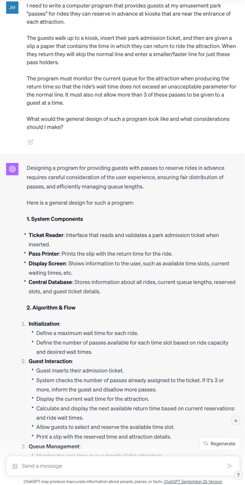 对于对主题公园预约系统一无所知的人来说,ChatGPT 的答案无疑是极具参考价值的。它甚至涉及到了我未曾考虑过的紧急处理方面。当然,专业的公园设计工程师可能会在这个答案中找出一些不足,但即便如此,这个答案为我提供了一个很好的出发点。
