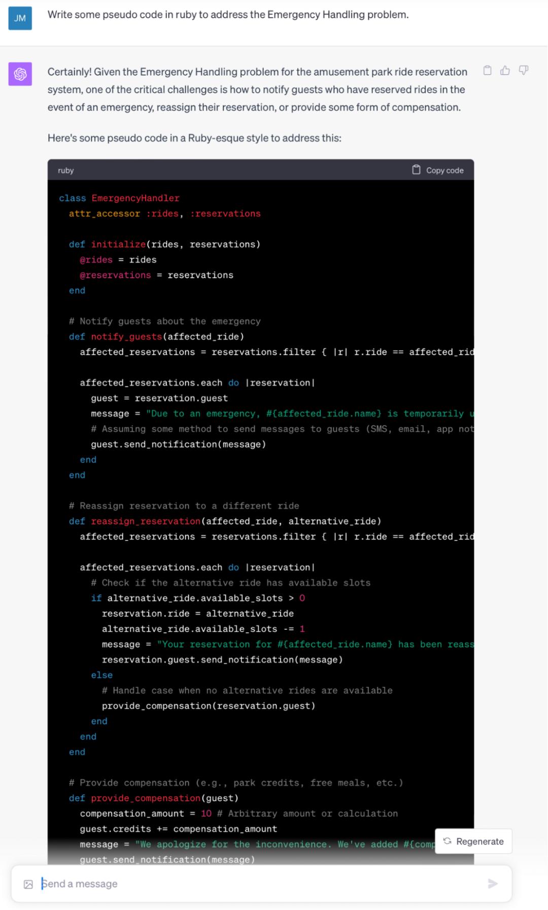 在代码中,我们进一步看到了在特定紧急情况下将预约重新分配给其他景点的考虑因素。如果没有可用的游乐设施,它会向客户道歉并提供赔偿。这会是最终用于生产环境的代码吗?当然不是。我将要花费很多时间来处理紧急系统的编写复杂性。这种复杂性有没有得到实质性的减少?答案是肯定的。