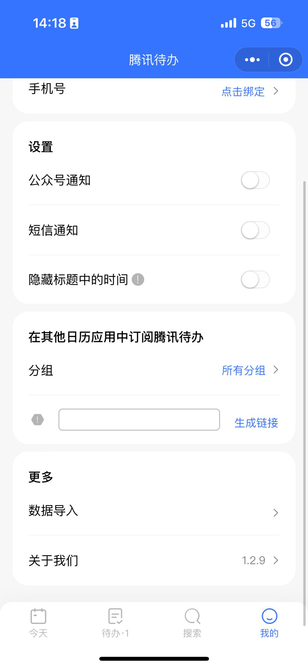 现在腾讯待办个人中心的二级功能较多,包含短信、公众号等多种设置,版本停留在1.2.9版本。
