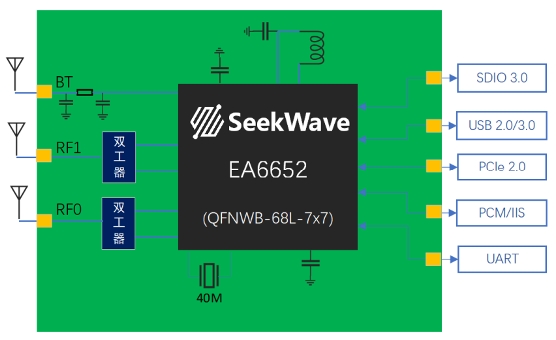 EA6652系列芯片支持多种连接接口,包括PCIe、USB3.0、USB2.0、SDIO3.0以及高速UART,同时支持PCM和IIS接口用于音频数据传输。