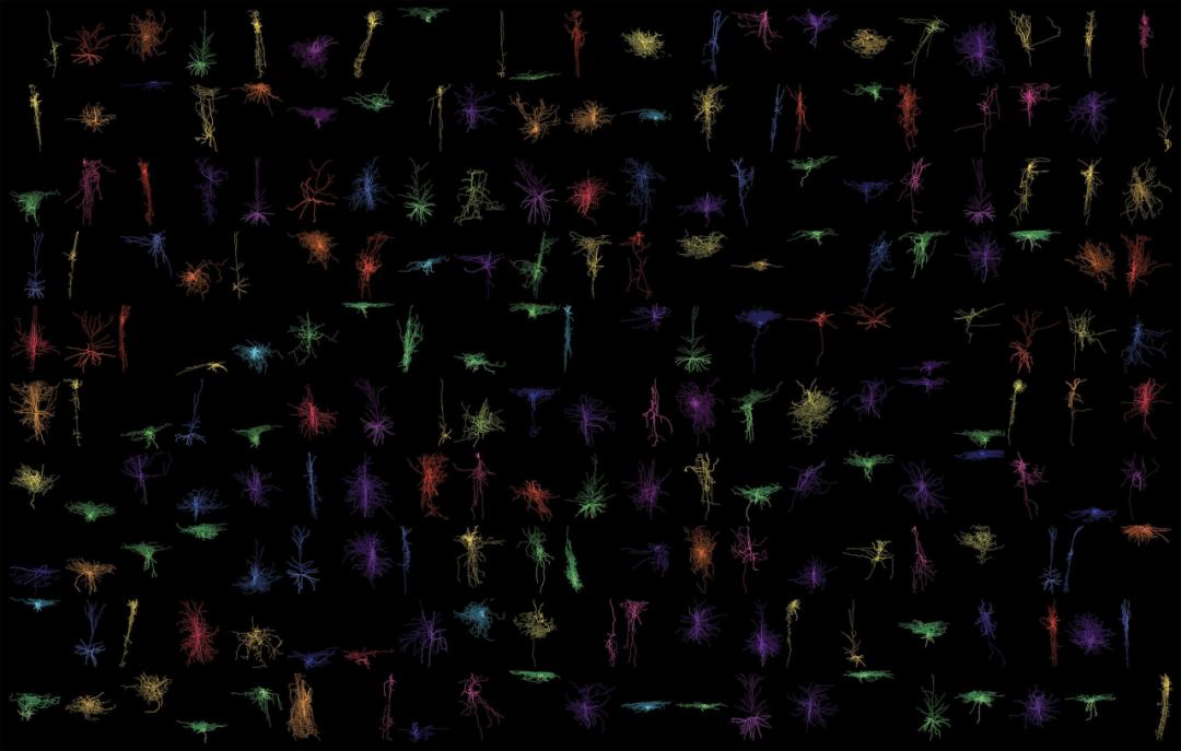 图片描绘的是从活体大脑切片中获得并重建的神经元三维效果图。多样的颜色和形状代表了构成人脑的、种类繁多的神经元亚型。