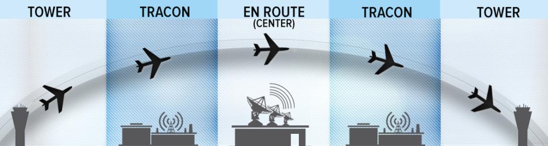 大致的对应关系为: TOWER - 塔台管制,TRACON - 进近管制,EN ROUTE - 区域管制 | globalair