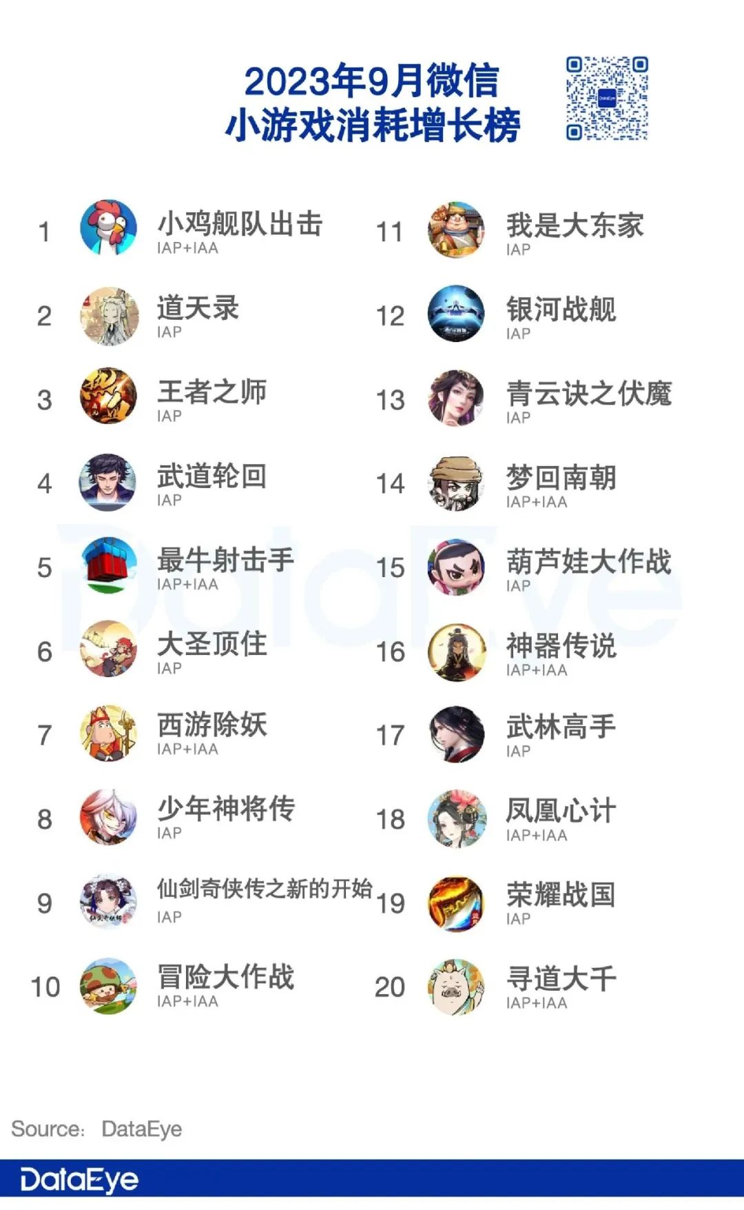 两款西游题材:《大圣顶住》位列消耗增长榜TOP6、《西游除妖》TOP7。这两款小游戏堪称9、10月微信小游戏畅销榜的新星。