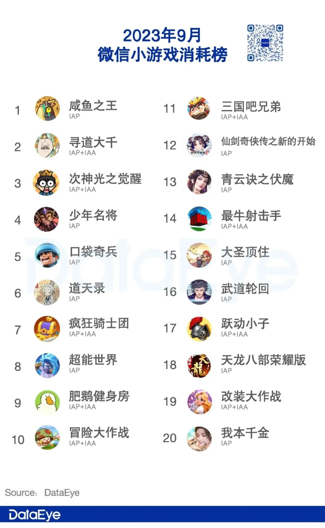 策略的分化,导致9月微信小游戏消耗榜TOP5变化:9月TOP5中有两名变动,8月TOP3的《超能世界》跌至TOP8,8月TOP2的《悦动小子》跌至TOP17,显然是暂避锋芒。而《咸鱼之王》《寻道大千》《次神光之觉醒》延续8月势头,9月稳居消耗榜三甲。