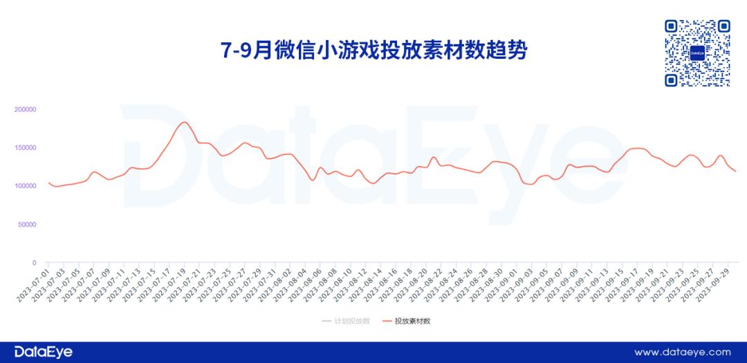 总素材量方面,DataEye-ADX数据显示,暑期档结束后。9月微信小游戏素材大盘总量基本与8月持平,日均投放素材量仍维持12万组左右。9月,微信小游戏素材大盘仍主要由头部小游戏主导。