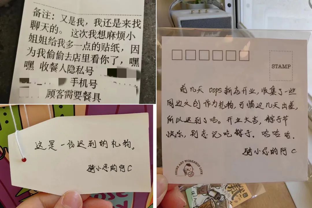 因为坚持每一杯外卖都这样做,顾客也记住了这项“小纸条服务”,会在下次点单时通过小票回应,也会在门店开业时送来祝福小纸条。