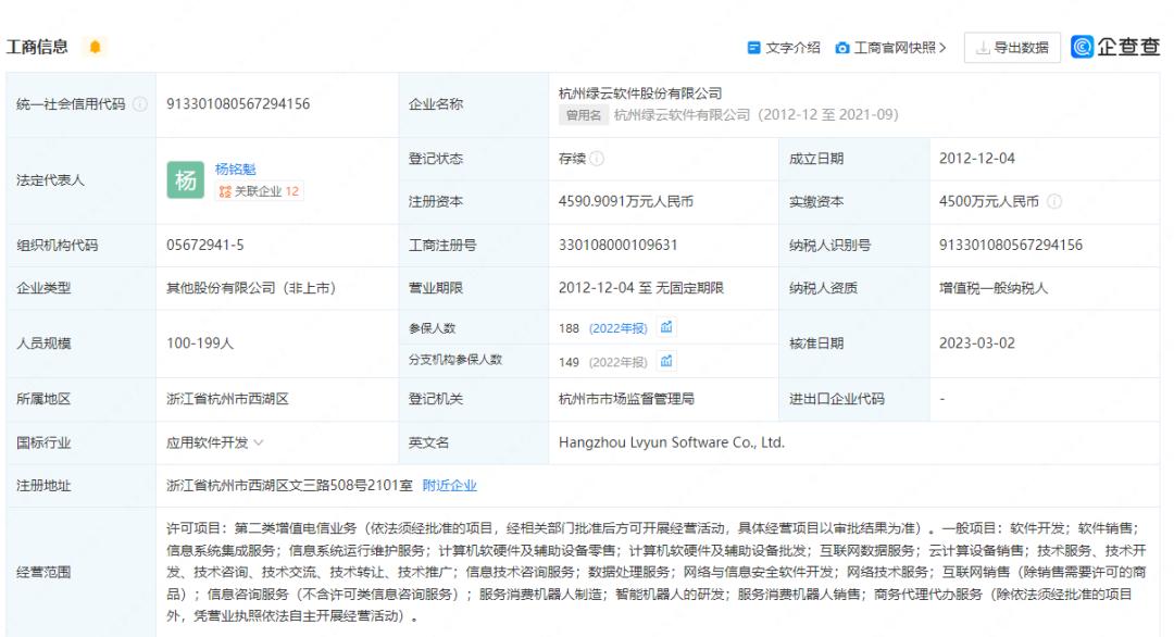 绿云上市的备案公告显示,绿云软件成立于2012年,注册资本4590万元,法定代表人为杨铭魁,持股比例显示,杨铭魁直接及间接持股25.65%、高亮直接持股21.4%,两人为公司的主要大股东。