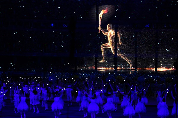 这一幕不禁让人想到2010年的广州亚运会开幕式,龙舟好手吴国冲踏着潮水而来,可爱的两位小童点燃鞭炮,让焰火点燃主火炬台……