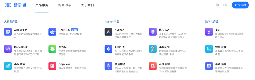 据其官网显示,当前智谱AI的业务主要分为了三大块,分别为大模型MaaS平台、AMiner 科技情报平台和认知数字人。由此形成了三大AI产品矩阵,大模型产品、AMiner产品以及数字人产品。其中,大模型产品不仅涵盖了基本对话机器人,还有编程、写作、绘画垂类的机器人划分。