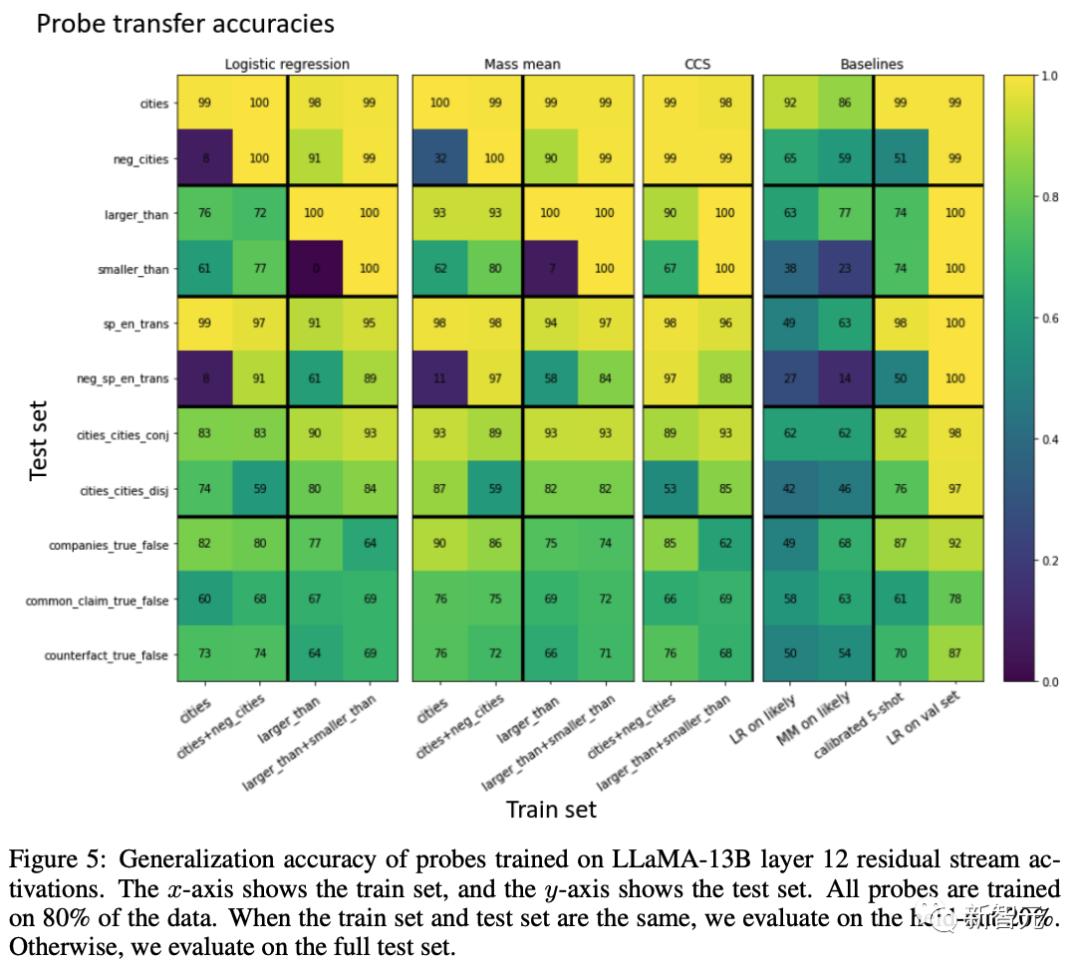 在本节中,研究人员在真/假陈述的数据集上训练探针,并测试它们对其他数据集的泛化。
