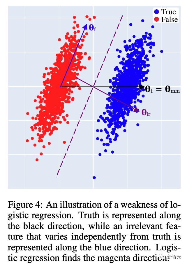 直观上看,逻辑回归将θ在θ上的小投影视为显着,并调整探测方向以减少θ的「干扰」。