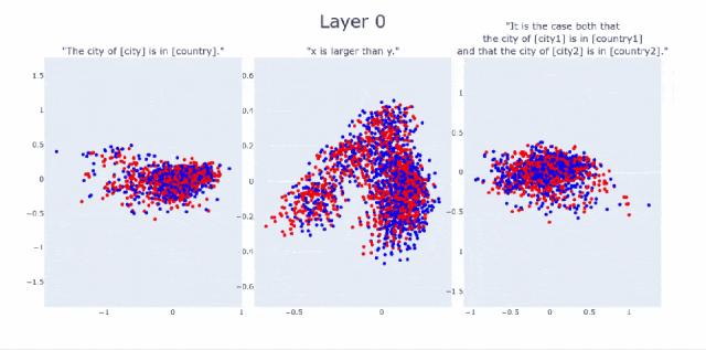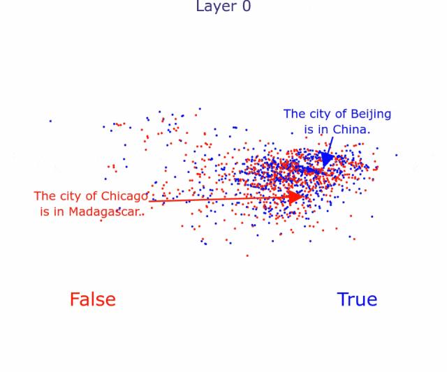 随着层数越来越高,大模型可越来越清晰地区分出,前者为假,后者为真。