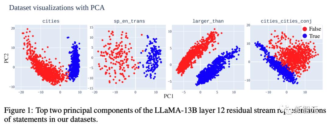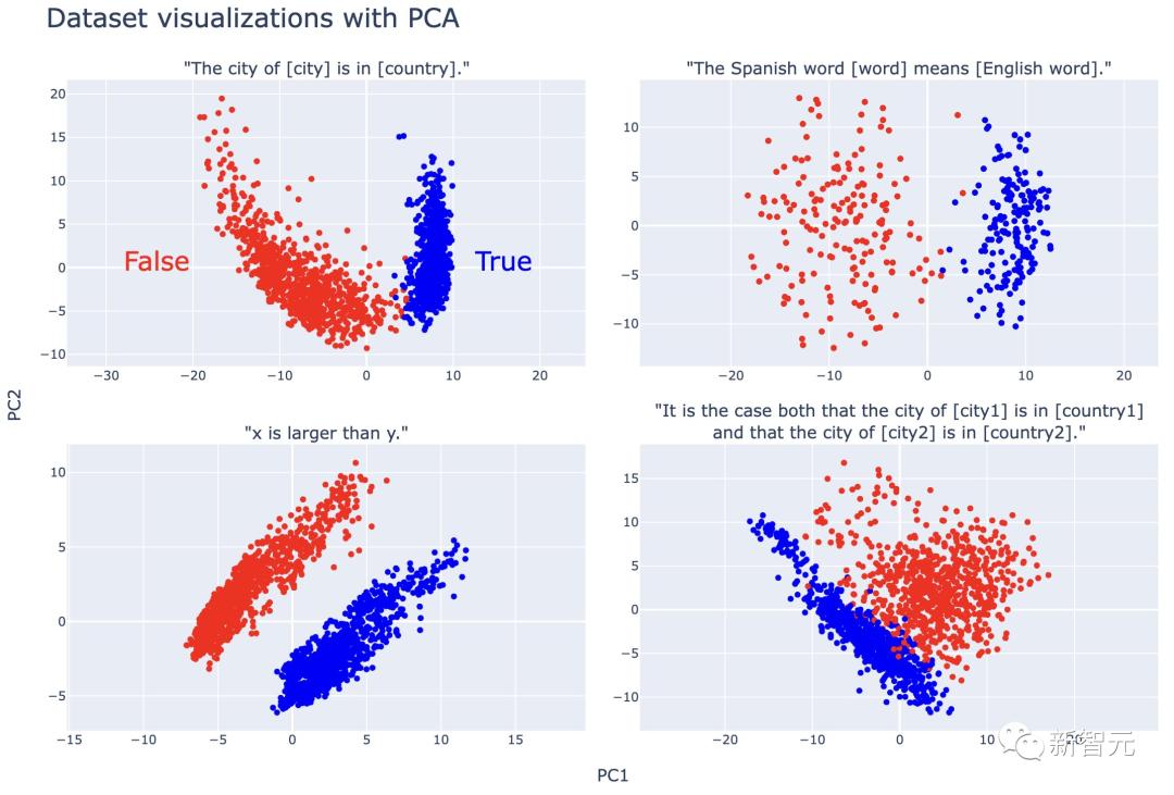 第一步,研究人员建立了简单、明确的真/假陈述数据集,并且把LLM对这些陈述的表征做了可视化。