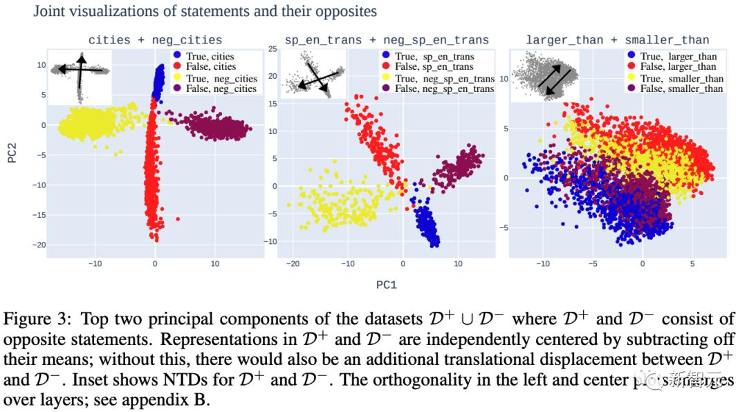虽然在数据集之间视觉上明显的分离轴并不总是对齐(如下图3),但研究人员认为这与LLM表征中存在真理方向是兼容的。