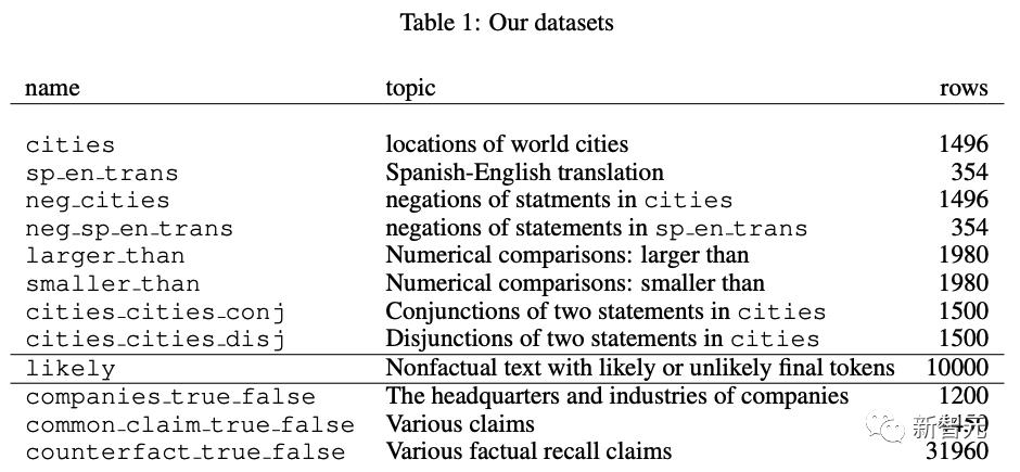 研究人员首先策划了高质量的真/假事实陈述数据集,这些陈述正确与否是显而易见的,比如: